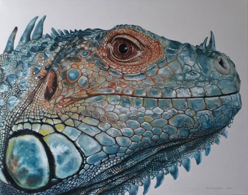 "Iguana Iguana", dubbelportret. Olieverf op doek, formaat 50 x 40 cm. Per stuk € 580,- inclusief lijst. Samen € 1100,-